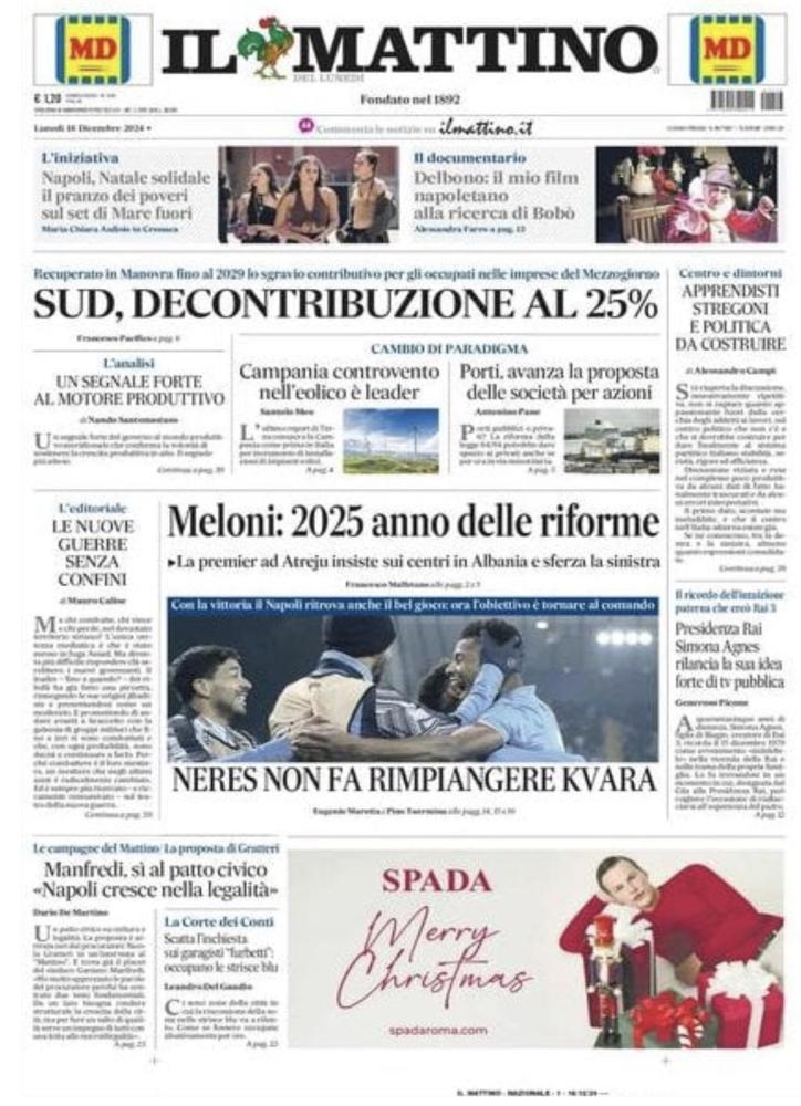 Sono tanti gli spunti che arrivano dalla prima pagina de Il Mattino. Il noto quotidiano si sofferma su alcuni degli argomenti più caldi del momento. Ecco alcuni titoli dell'ultima edizione: "Neres non fa rimpiangere Kvara. Con la vittoria il Napoli ritrova anche il bel gioco. Ora l'obiettivo è tonare al comando" si legge nello spazio dedicato allo sport.