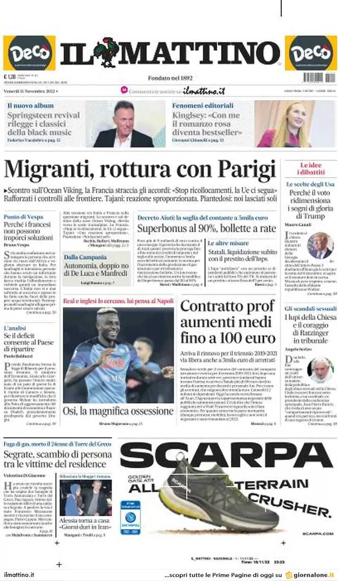 Sono tanti gli spunti che arrivano dalla prima pagina de Il Mattino. Il noto quotidiano si sofferma su alcuni degli argomenti più caldi del momento. Ecco alcuni titoli dell'ultima edizione: "Osi, la magnifica ossessione. Real e inglesi lo cercano, lui pensa al Napoli", si legge in merito allo sport.