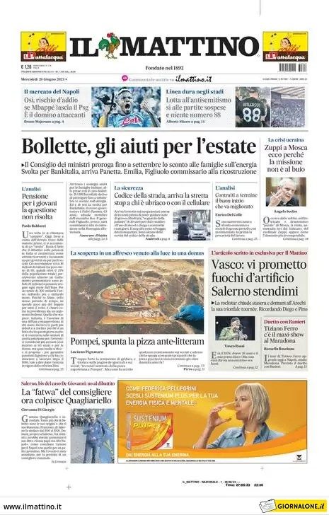 Sono tanti gli spunti che arrivano dalla prima pagina de Il Mattino. Il noto quotidiano si sofferma su alcuni degli argomenti più caldi del momento. Ecco alcuni titoli dell'ultima edizione: "Osi, rischio addio se Mbappè lascia il PSG. E' il domino attaccanti" si legge nel trafiletto dedicato allo sport.