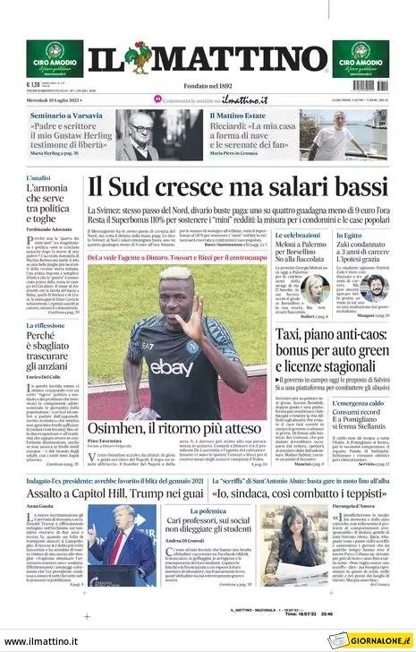 Sono tanti gli spunti che arrivano dalla prima pagina de Il Mattino. Il noto quotidiano si sofferma su alcuni degli argomenti più caldi del momento. Ecco alcuni titoli dell'ultima edizione: "Osimhen, il ritorno più atteso. ADL vede l'agente a Dimaro, Tousart e Ricci per il centrocampo" si legge nel trafiletto dedicato allo sport.