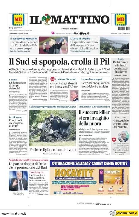 Sono tanti gli spunti che arrivano dalla prima pagina de Il Mattino. Il noto quotidiano si sofferma su alcuni degli argomenti più caldi del momento. Ecco alcuni titoli dell'ultima edizione: "La partita doppia di DeLa: c'è la promozione del Bari" si legge nel trafiletto dedicato allo sport.
