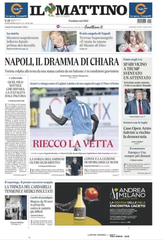 Sono tanti gli spunti che arrivano dalla prima pagina de Il Mattino. Il noto quotidiano si sofferma su alcuni degli argomenti più caldi del momento. Ecco alcuni titoli dell'ultima edizione: "Riecco la vetta. Azzurri a valanga contro il Cagliari: Lukaku e Kvara coppia dei sogni. E l'Inter si ferma. La forza dei campioni oltre ogni difetto. Conte e la lezione di sporcarsi le mani" si legge nello spazio dedicato allo sport.