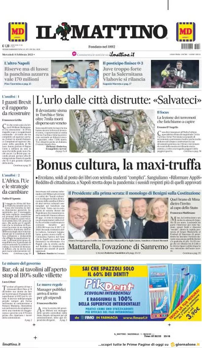 Sono tanti gli spunti che arrivano dalla prima pagina de Il Mattino. Il noto quotidiano si sofferma su alcuni degli argomenti più caldi del momento. Ecco alcuni titoli dell'ultima edizione: "Riserve ma di lusso: la panchina azzurra vale 170 milioni". E ancora: "Juve troppo forte per la Salernitana. Vlahovic si rilancia", si legge in merito allo sport.