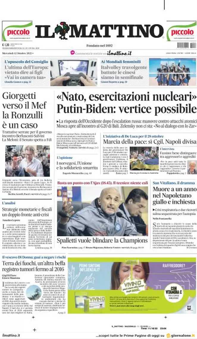 Sono tanti gli spunti che arrivano dalla prima pagina de Il Mattino. Il noto quotidiano si sofferma su alcuni degli argomenti più caldi del momento. Ecco alcuni titoli dell'ultima edizione: "Basta un punto con l'Ajax. Spalletti vuole blindare la Champions. Il tecnico: niente cali", si legge in merito allo sport.