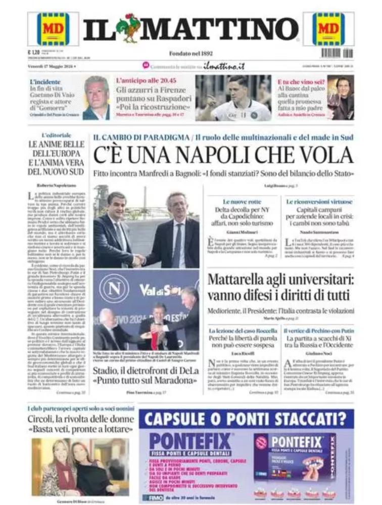 Sono tanti gli spunti che arrivano dalla prima pagina de Il Mattino. Il noto quotidiano si sofferma su alcuni degli argomenti più caldi del momento. Ecco alcuni titoli dell'ultima edizione: "Gli azzurri a Firenze puntano su Raspadori. Poi la ricostruzione". E ancora: "Stadio, il dietrofront di DeLa: punto tutto sul Maradona" si legge nello spazio dedicato allo sport.
