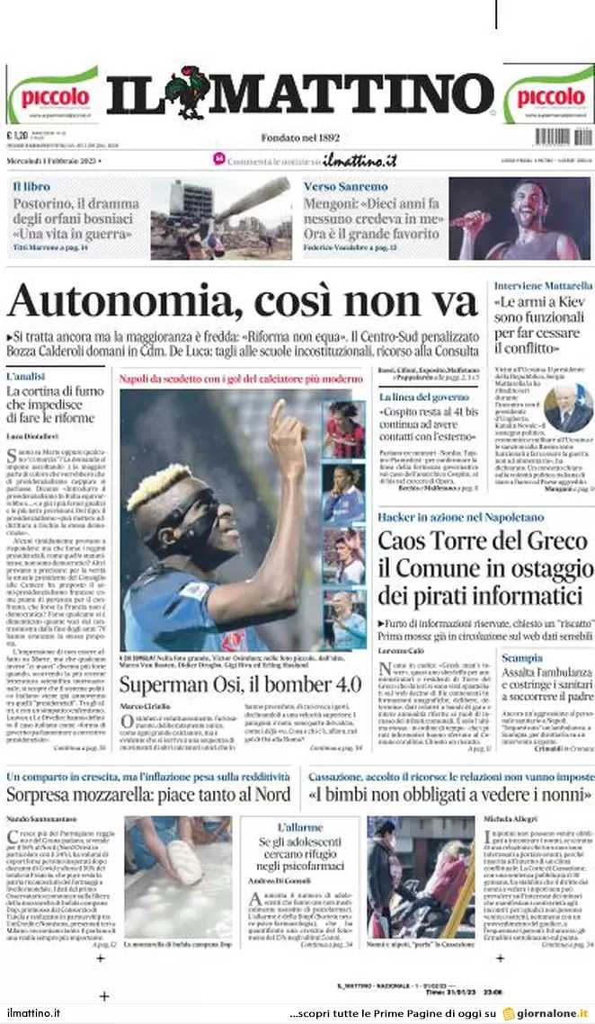 Sono tanti gli spunti che arrivano dalla prima pagina de Il Mattino. Il noto quotidiano si sofferma su alcuni degli argomenti più caldi del momento. Ecco alcuni titoli dell'ultima edizione: "Superman Osi, il bomber 4.0. Napoli da Scudetto con i gol del calciatore più moderno", si legge in merito allo sport.