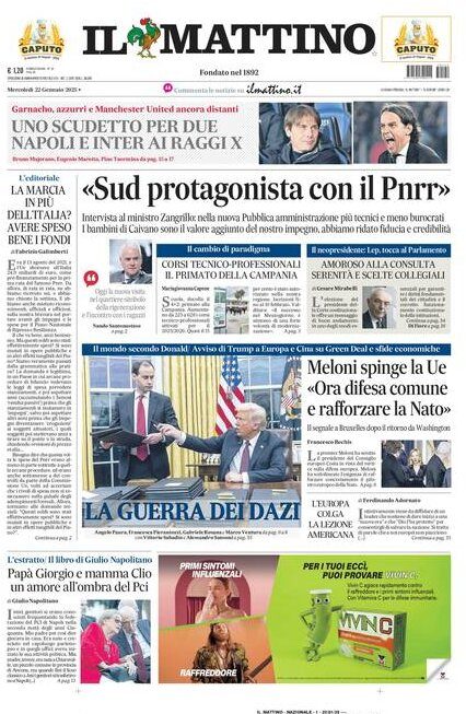 Sono tanti gli spunti che arrivano dalla prima pagina de Il Mattino. Il noto quotidiano si sofferma su alcuni degli argomenti più caldi del momento. Ecco alcuni titoli dell'ultima edizione: "Uno Scudetto per due: Napoli e Inter ai raggi X" si legge nello spazio dedicato allo sport.