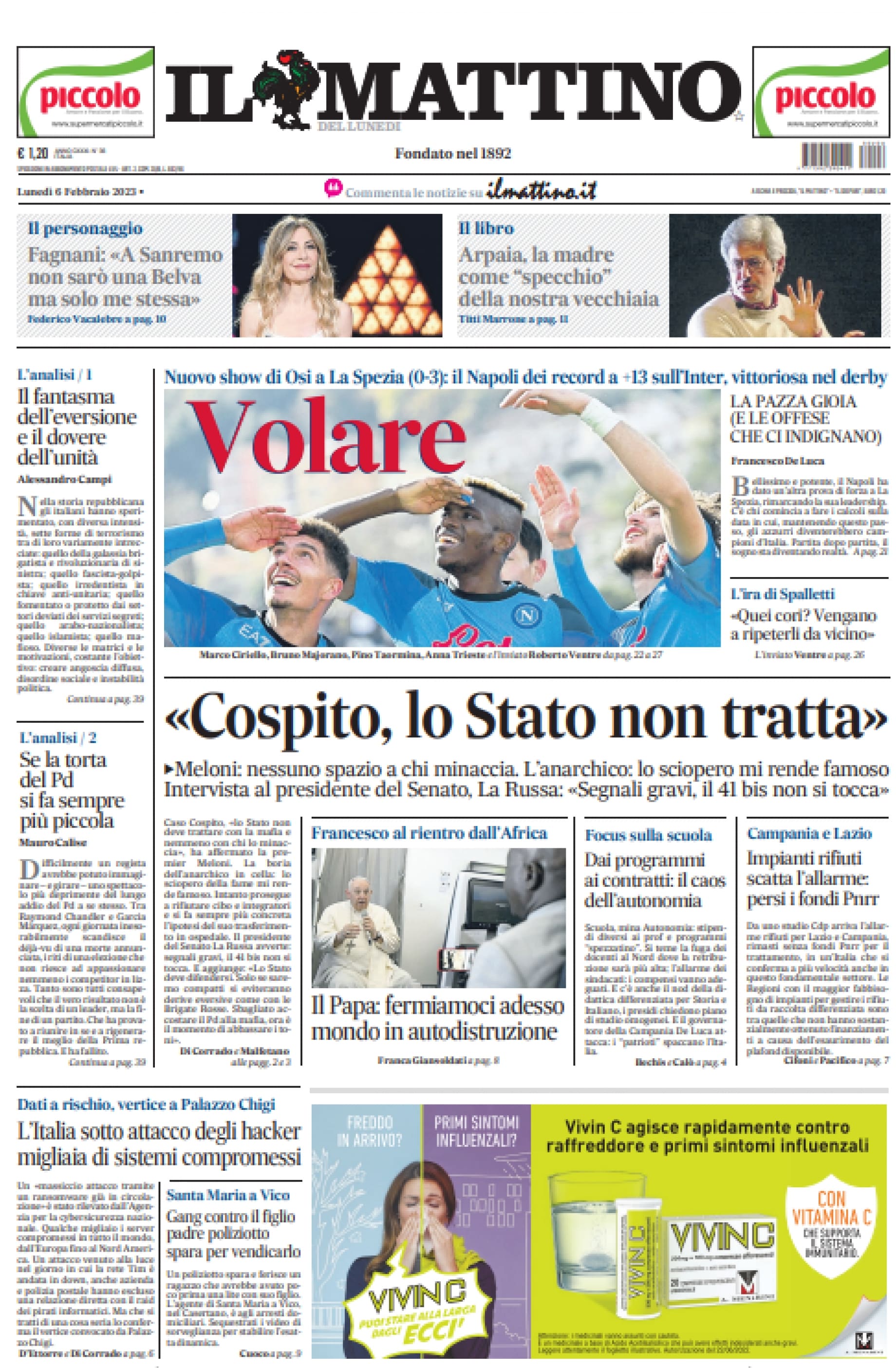 Sono tanti gli spunti che arrivano dalla prima pagina de Il Mattino. Il noto quotidiano si sofferma su alcuni degli argomenti più caldi del momento. Ecco alcuni titoli dell'ultima edizione: "Volare. Nuovo show di Osi a La Spezia (0-3): il Napoli dei record a +13 sull'Inter, vittoriosa nel derby". E ancora: "La pazza gioia (e le offese che ci indignano)", si legge in merito allo sport.
