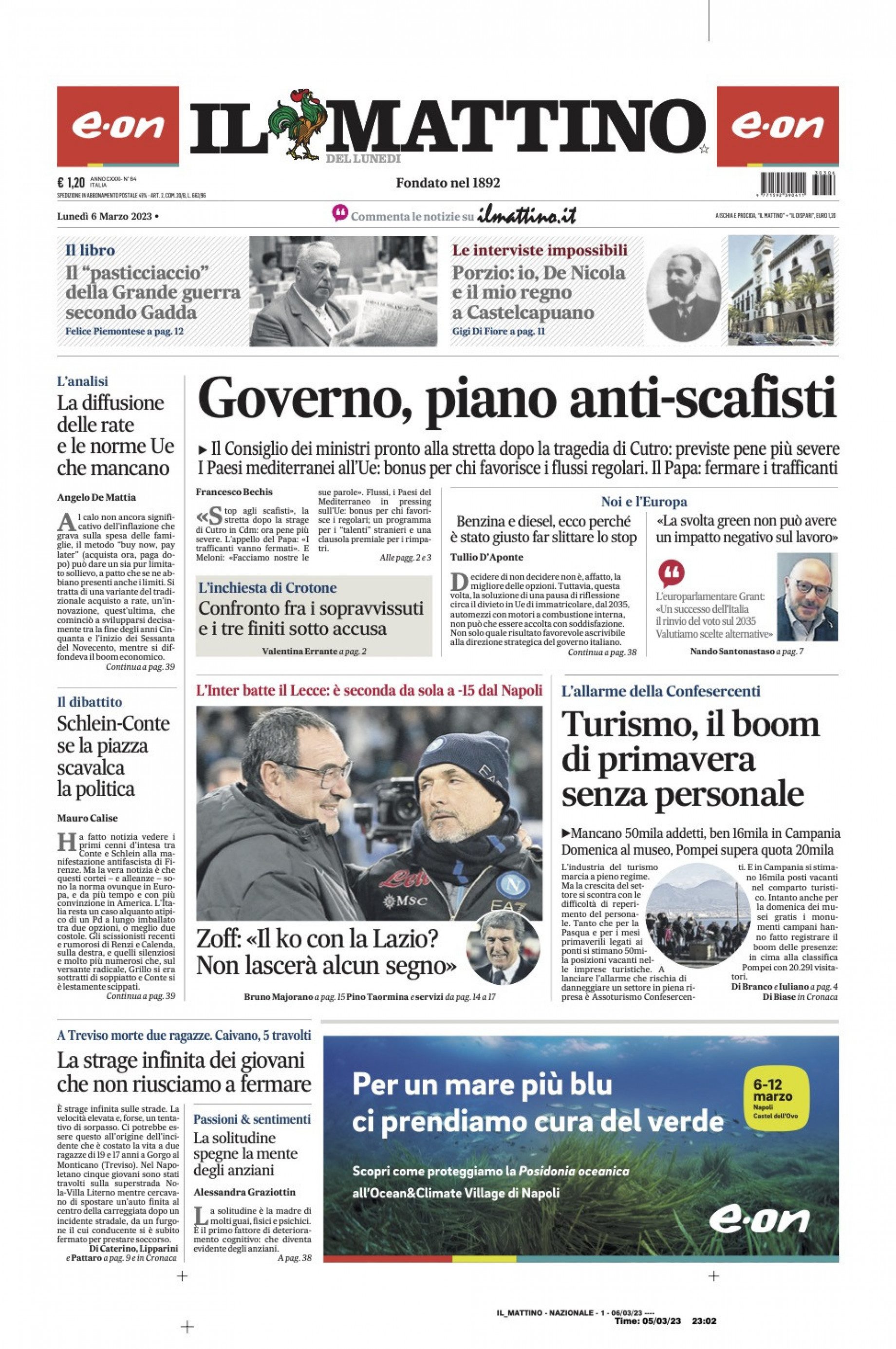 Sono tanti gli spunti che arrivano dalla prima pagina de Il Mattino. Il noto quotidiano si sofferma su alcuni degli argomenti più caldi del momento. Ecco alcuni titoli dell'ultima edizione: "Zoff: KO con la Lazio? Non lascerà alcun segno". E ancora: "L'Inter batte il Lecce: è seconda da sola a -15 dal Napoli", si legge in merito allo sport.