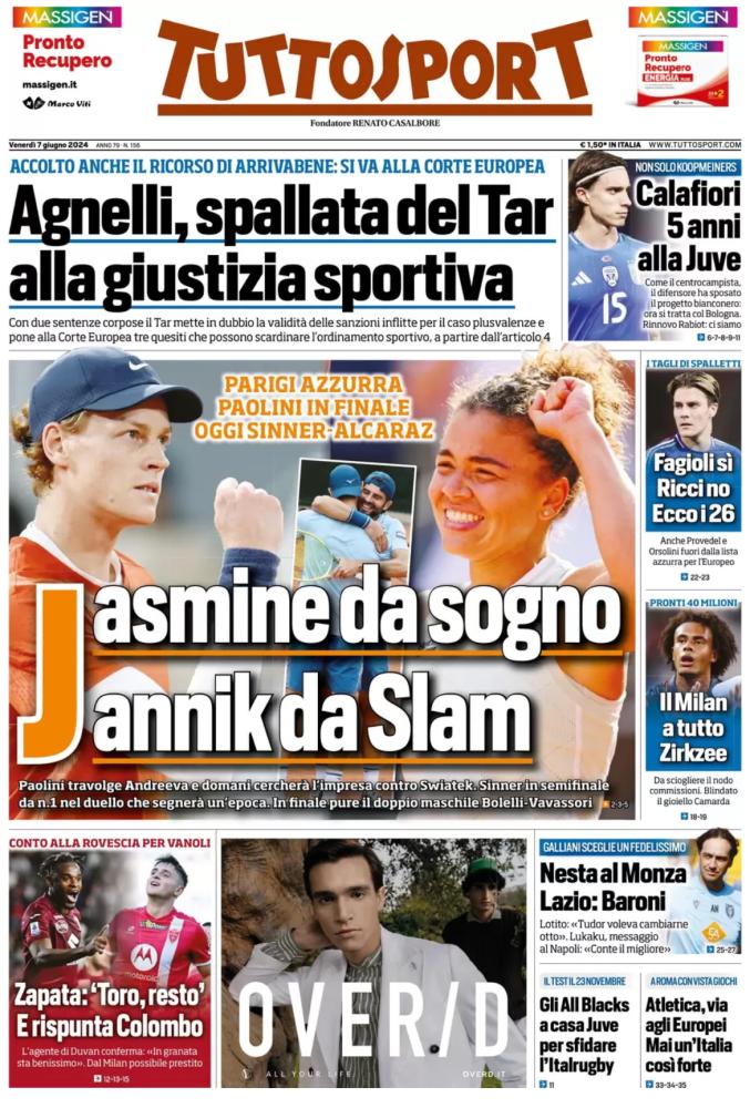 Sono tanti gli spunti che arrivano dalla prima pagina di Tuttosport. Il noto quotidiano si sofferma su alcuni degli argomenti più caldi del momento. Ecco alcuni titoli dell'ultima edizione: "Calafiori, 5 anni alla Juve. Non solo Koopmeiners". E ancora: "Agnelli, spallata del Tar alla giustizia sportiva. Accolto anche il ricorso di Arrivabbene: si va alla corte europea" si legge sul giornale.
