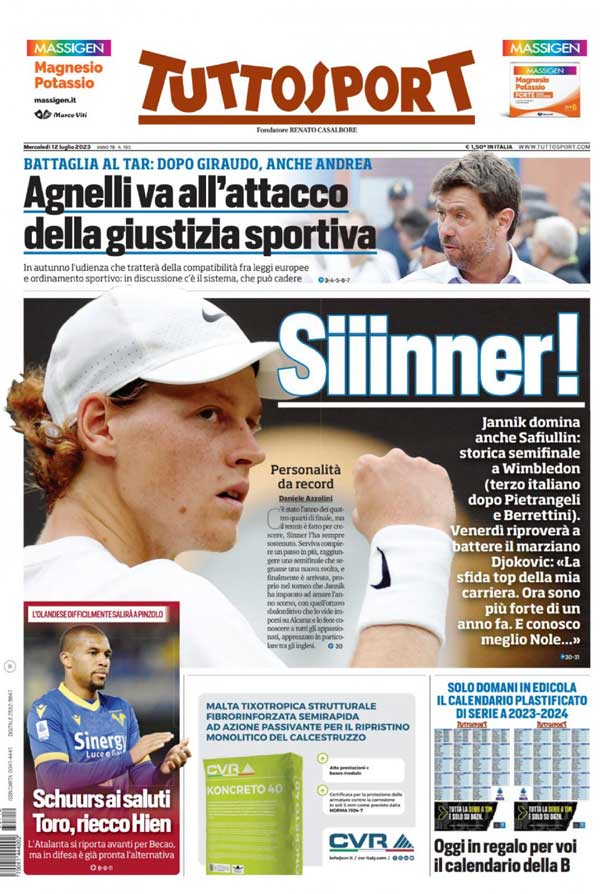 PRIMA PAGINA TUTTOSPORT - Agnelli va all'attacco. Schuurs ai saluti