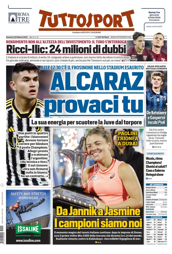 "Alcaraz, provaci tu", titola l'edizione odierna di TuttoSport in merito al giocatore della Juventus. Spazio anche al Torino: "Ricci-Ilic: 24 milioni di dubbi".
