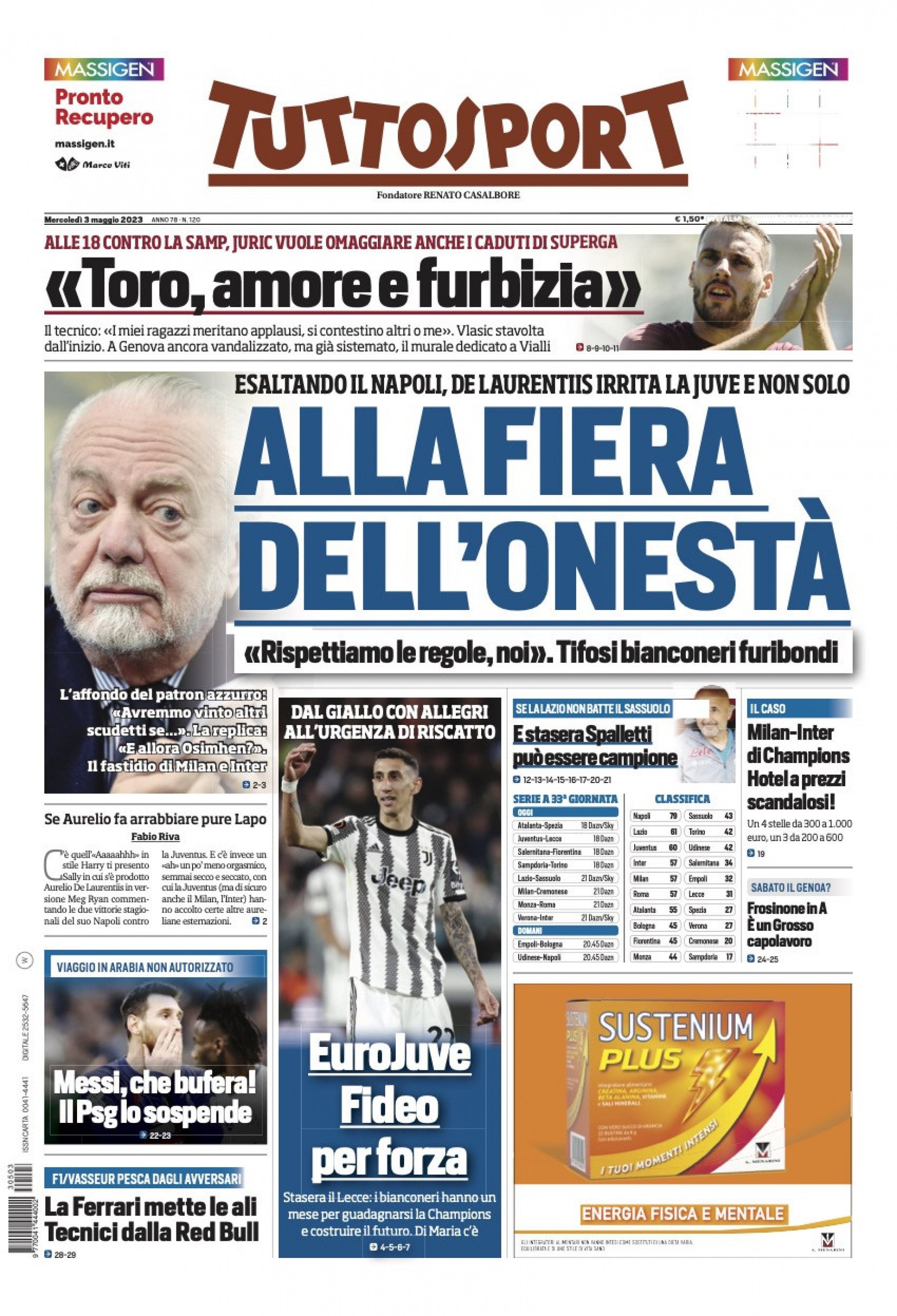 Sono tanti gli spunti che arrivano dalla prima pagina di Tuttosport. Il noto quotidiano si sofferma su alcuni degli argomenti più caldi del momento. Ecco alcuni titoli dell'ultima edizione: "Alla fiera dell'onestà. Esaltando il Napoli, De Laurentiis irrita la Juve e non solo. Tifosi bianconeri furibondi".