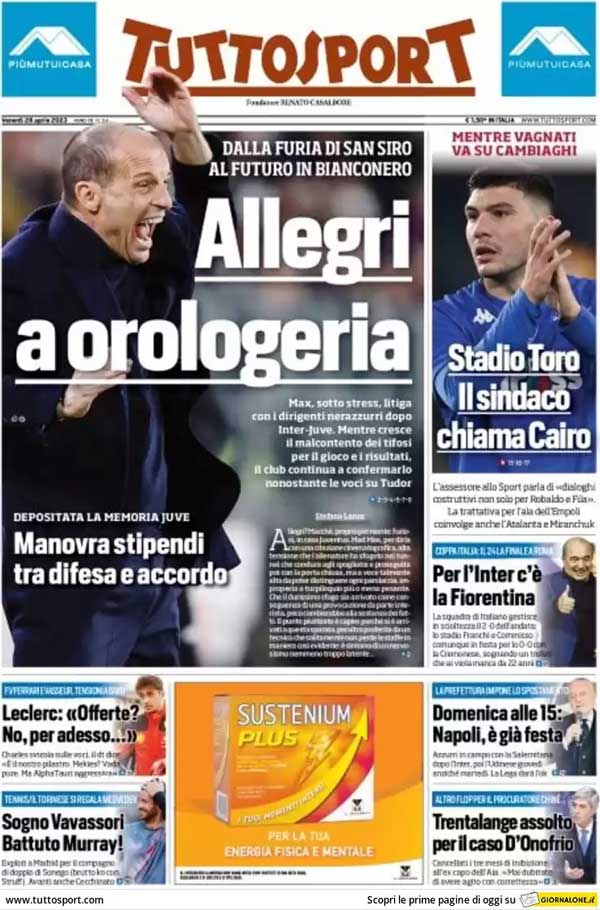 "Allegri a orologeria", titola l'edizione odierna di TuttoSport in merito al futuro del tecnico della squadra bianconera. Spazio anche al Napoli: "Domenica alle 15: Napoli, è già festa", si legge.