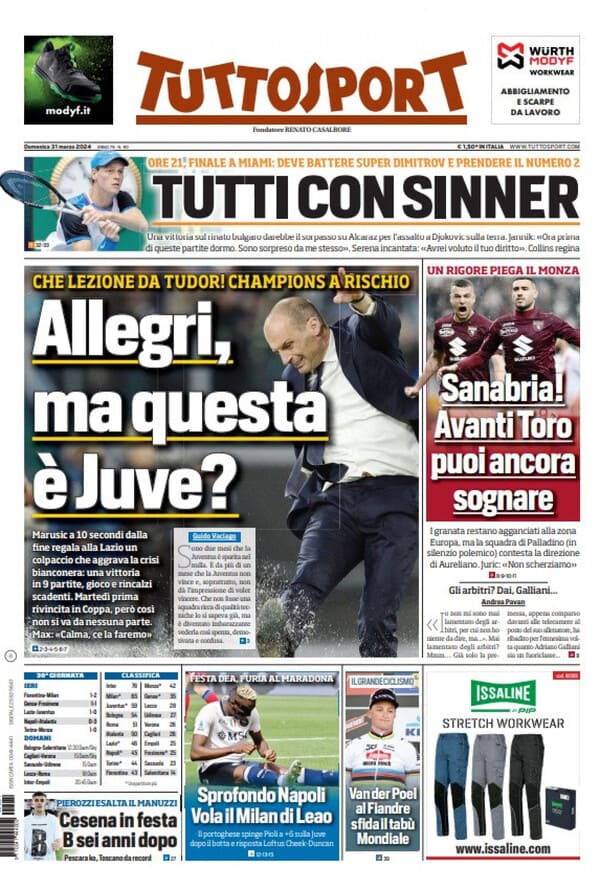 L'edizione odierna di Tuttosport dà ampio spazio alla Juventus di Allegri dopo la sconfitta con la Lazio titolando "Allegri, ma questa è Juve?". Inoltre il giornale dedica spazio anche al Torino dopo il successo contro il Monza. Poi spazio anche ai partenopei: "Sprofondo Napoli".