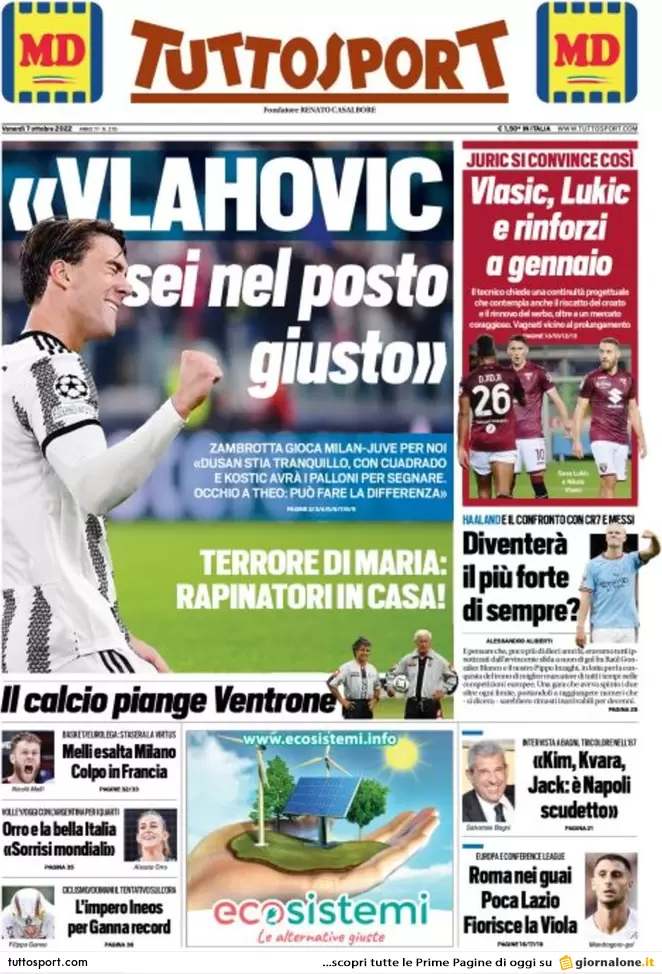 La prima pagina del noto quotidiano si sofferma sui temi più caldi del momento relativi al calcio italiano e non solo.