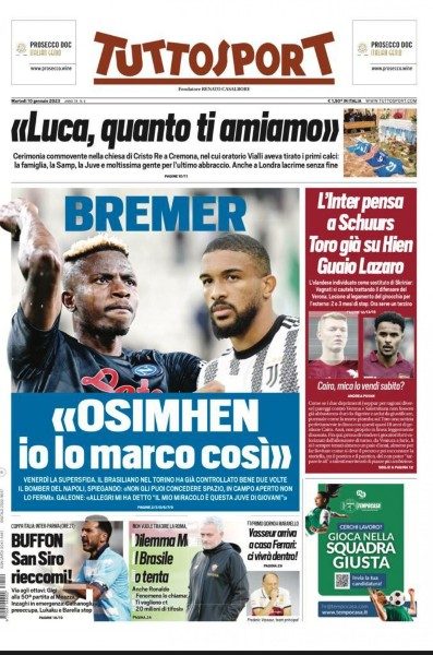 PRIMA PAGINA TUTTOSPORT - Bremer: "Osimhen io lo marco così"