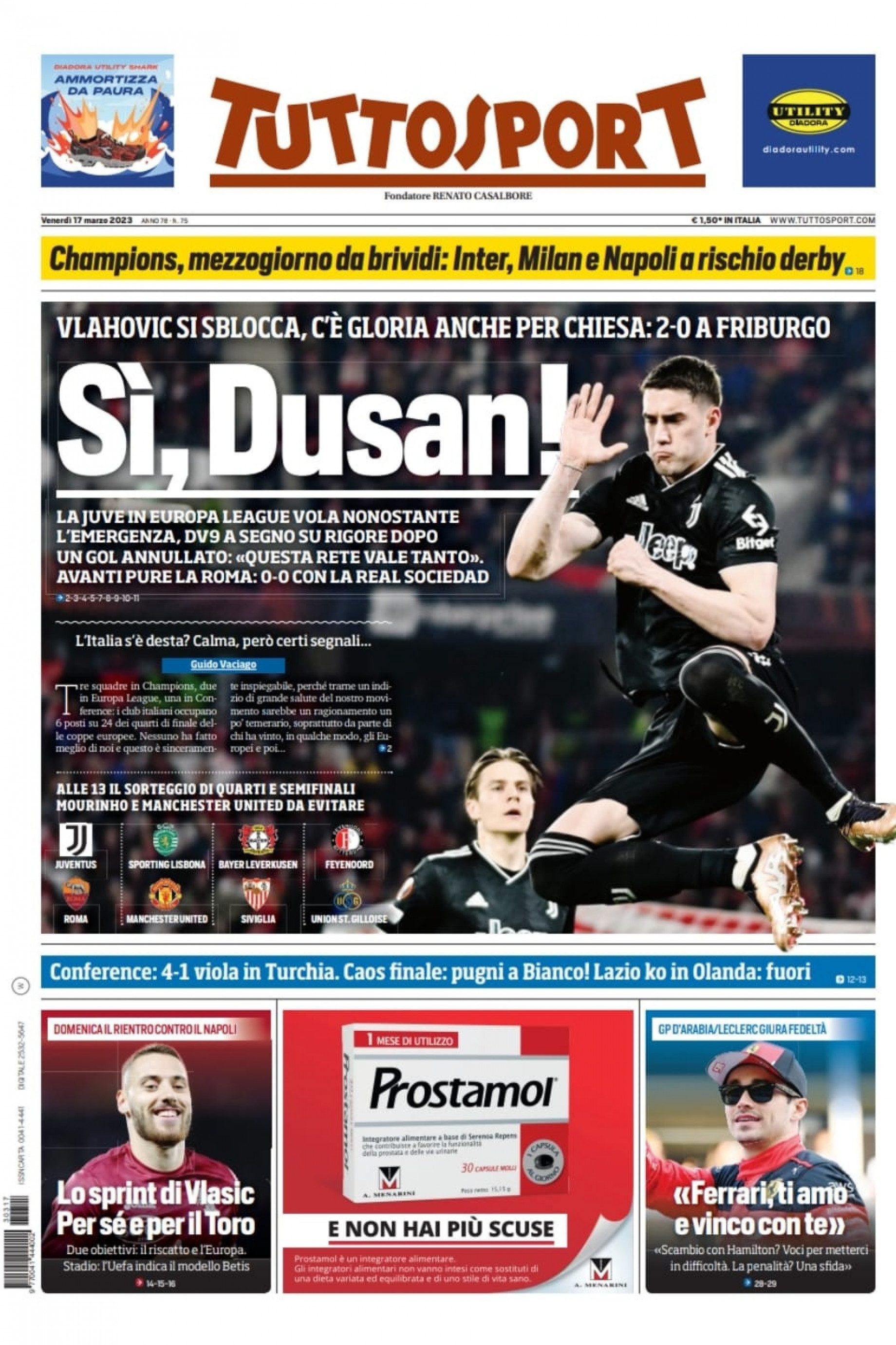 Sono tanti gli spunti che arrivano dalla prima pagina di Tuttosport. Il noto quotidiano si sofferma su alcuni degli argomenti più caldi del momento. Ecco alcuni titoli dell'ultima edizione: "Sì, Dusan! Vlahovic si sblocca, c'è gloria anche per Chiesa". E ancora: "Champions, mezzogiorno da brividi: Inter, Milan e Napoli a rischio derby".