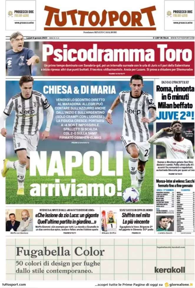 Sono tanti gli spunti che arrivano dalla prima pagina di Tuttosport. Il noto quotidiano si sofferma su alcuni degli argomenti più caldi del momento. Ecco alcuni titoli dell'ultima edizione: "Chiesa e Di Maria: Napoli, arriviamo! Venerdì lo scontro diretto al Maradona".