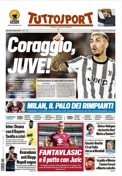 Sono tanti gli spunti che arrivano dalla prima pagina di Tuttosport. Il noto quotidiano si sofferma su alcuni degli argomenti più caldi del momento. Ecco alcuni titoli dell'ultima edizione: "Coraggio, Juve. Primo tempo da incubo, ripresa all'altezza. Milan, il palo dei rimpianti".