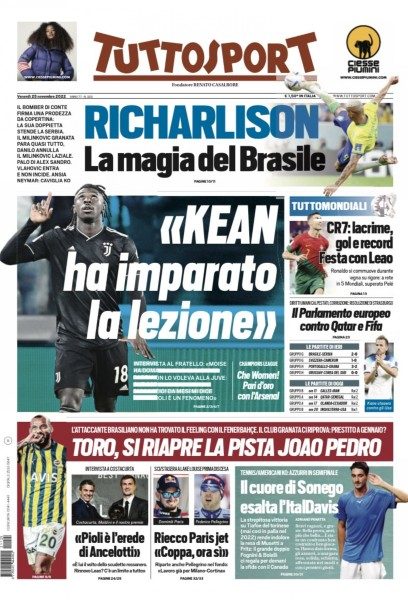 Sono tanti gli spunti che arrivano dalla prima pagina di Tuttosport. Il noto quotidiano si sofferma su alcuni degli argomenti più caldi del momento. Ecco alcuni titoli dell'ultima edizione: "Kean ha imparato la lezione: intervista al fratello di Moise. Costacurta: Pioli è l'erede di Ancelotti".