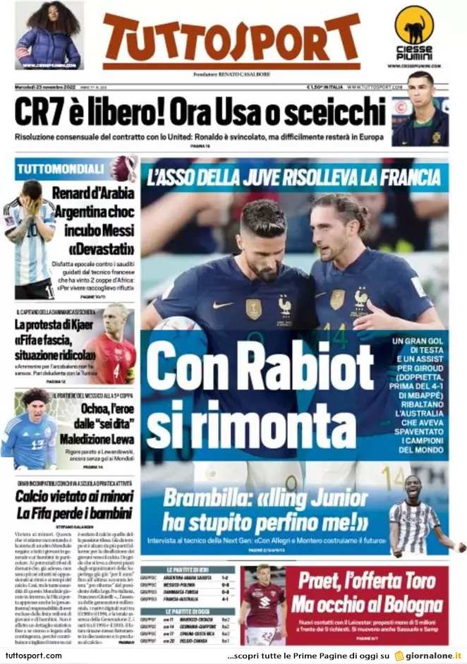 Sono tanti gli spunti che arrivano dalla prima pagina di Tuttosport. Il noto quotidiano si sofferma su alcuni degli argomenti più caldi del momento. Ecco alcuni titoli dell'ultima edizione: "Con Rabiot si rimonta. L'asso della Juve risolleva la Francia. CR7 è libero! Ora USA o sceicchi".
