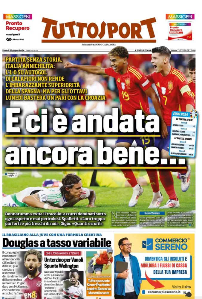 Sono tanti gli spunti che arrivano dalla prima pagina di Tuttosport. Il noto quotidiano si sofferma su alcuni degli argomenti più caldi del momento. Ecco alcuni titoli dell'ultima edizione: "E ci è andata ancora bene...Partita senza storia, Italia annichilita. L'imbarazzante superiorità della Spagna" si legge sul giornale.