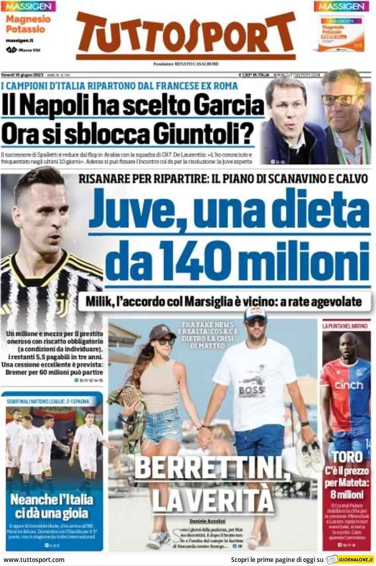 Sono tanti gli spunti che arrivano dalla prima pagina di Tuttosport. Il noto quotidiano si sofferma su alcuni degli argomenti più caldi del momento. Ecco alcuni titoli dell'ultima edizione: "Il Napoli ha scelto Garcia, ora si sblocca Giuntoli? Il successore di Spalletti è reduce dal flop in Arabia con la squadra di CR7".