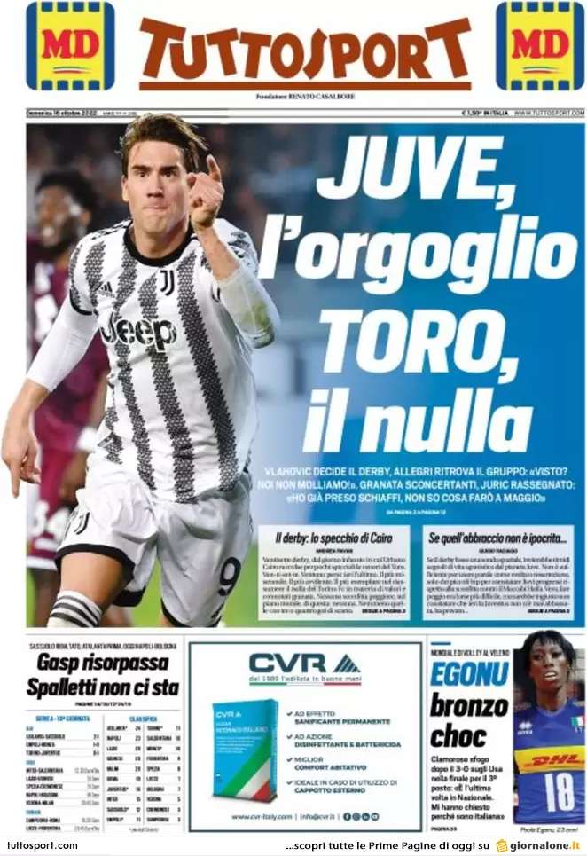 Sono tanti gli spunti che arrivano dalla prima pagina di Tuttosport. Il noto quotidiano si sofferma su alcuni degli argomenti più caldi del momento. Ecco alcuni titoli dell'ultima edizione: "Juve, l'orgoglio. Toro, il nulla. Vlahovic decide il Derby, Allegri ritrova il gruppo. Gasp risorpassa, Spalletti non ci sta".