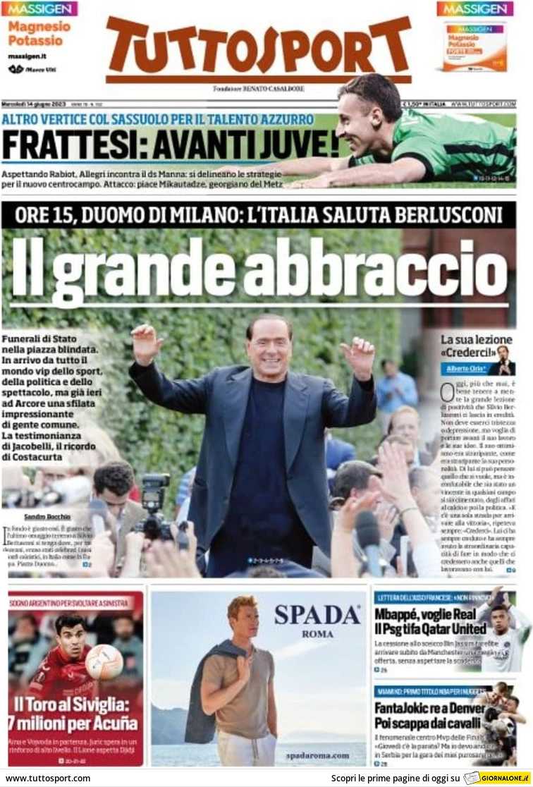 Sono tanti gli spunti che arrivano dalla prima pagina di Tuttosport. Il noto quotidiano si sofferma su alcuni degli argomenti più caldi del momento. Ecco alcuni titoli dell'ultima edizione: "Il grande abbraccio. Ore 15:00, Duomo di Milano: l'Italia saluta Berlusconi". E ancora: "Frattesi: avanti Juve! Altro vertice col Sassuolo per il talento azzurro".
