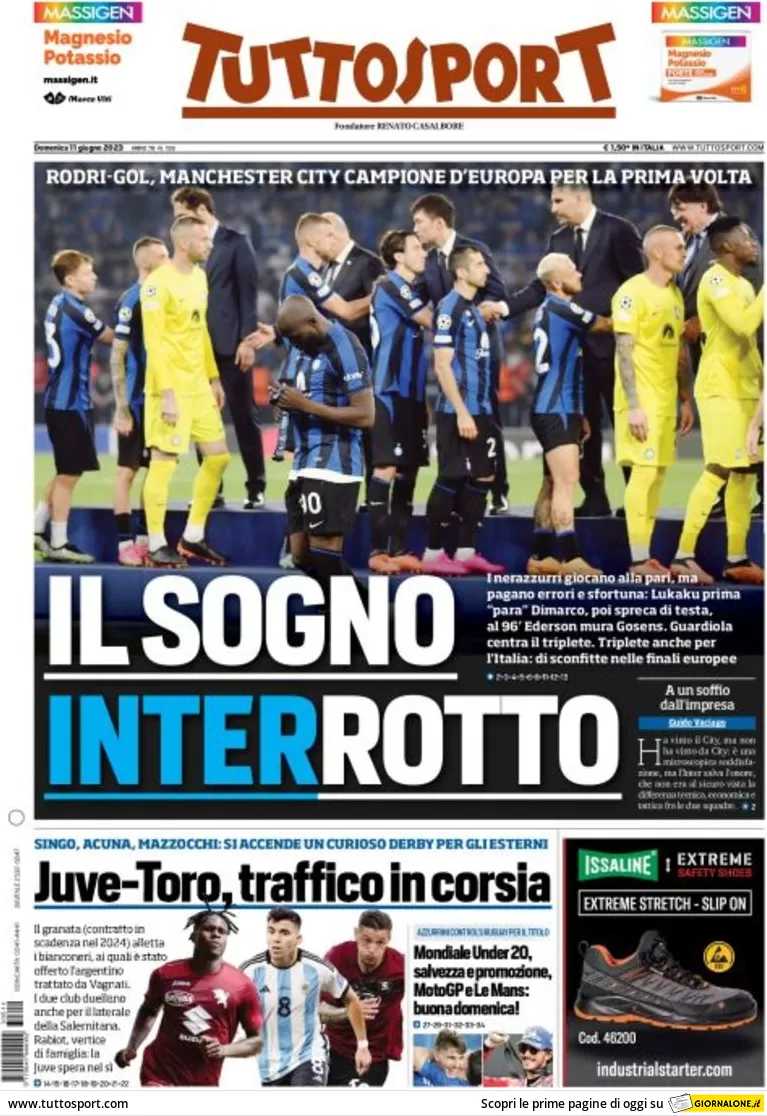 PRIMA PAGINA TUTTOSPORT - Il sogno Inter-rotto. Manchester City campione