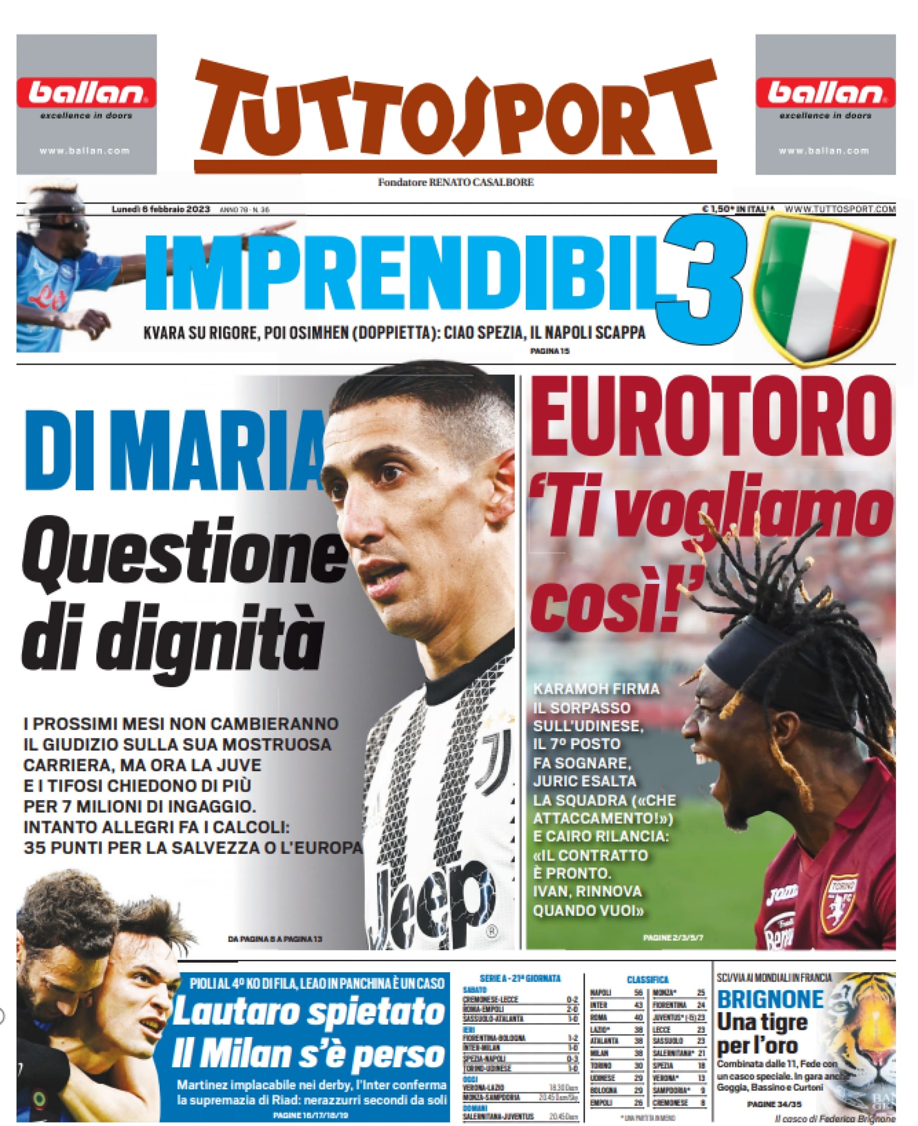 Sono tanti gli spunti che arrivano dalla prima pagina di Tuttosport. Il noto quotidiano si sofferma su alcuni degli argomenti più caldi del momento. Ecco alcuni titoli dell'ultima edizione: "Imprendibili 3. Kvara su rigore, poi Osimhen (doppietta): ciao Spezia, il Napoli scappa".