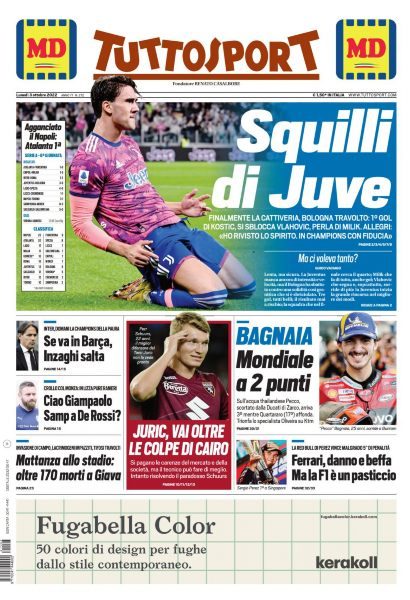 Sono tanti gli spunti che arrivano dalla prima pagina di Tuttosport. Il noto quotidiano si sofferma su alcuni degli argomenti più caldi del momento. Ecco alcuni titoli dell'ultima edizione: "Inter, domani la Champions della paura: se va in Barca, Inzaghi salta. Squilli di Juve: finalmente la cattiveria".