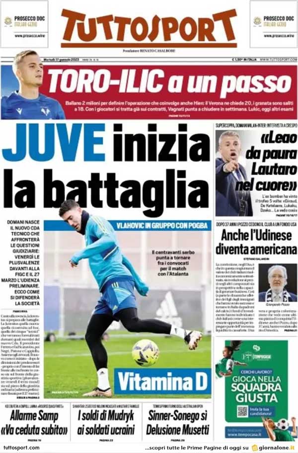 "Juve, inizia la battaglia", titola l'edizione odierna di TuttoSport. "Toro-Ilic a un passo", il club granata è vicinissimo al centrocampista del Verona.