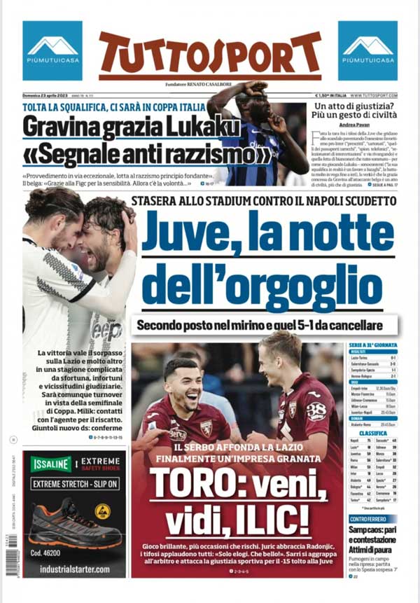 "Juve, la notte dell'orgoglio", così titola Tuttosport riguardo il big match tra Juventus e Napoli, dove i bianconeri sono chiamati a rispondere dopo il 5-1 dell'andata in favore dei partenopei. Spazio anche al Torino, che ha fermato la Lazio all'Olimpico grazie a un gol dalla distanza di Ilic: "Toro: veni, vidi, Ilic". Nel taglio alto, infine, spazio alla decisione di Gravina di rimuovere la squalifica a Lukaku in Coppa Italia.