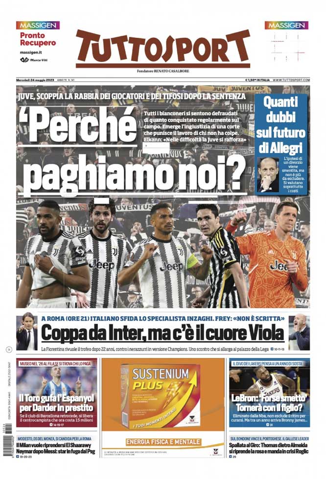 "Perché paghiamo noi?", titola l'edizione odierna di TuttoSport. "Juve, scoppia la rabbia dei giocatori", si legge sulla prima pagina del quotidiano torinese.