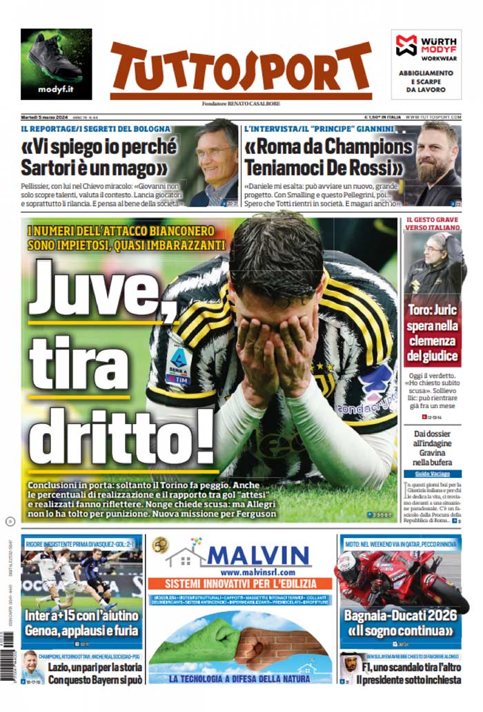 "Juve, tira dritto!", Tuttosport mette in rilievo alcuni dati sull'attacco della Juventus: i bianconeri sono dietro solo al Torino per quanto riguarda le conclusioni in porta e anche le percentuali di realizzazione e il rapporto tra gol attesi e realizzati non sono dei migliori. In alto due interviste, una sui segreti di Sartori, uomo mercato del Bologna, l'altra sull'ottimo percorso della Roma di De Rossi.