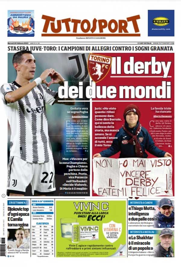 L'edizione odierna di Tuttosport titola: "Il derby dei due mondi, Juve-Toro. Stasera i campioni di Allegri contro i sogni granata". In taglio basso spazio anche al tennis: "Djkovic top d'ogni d'epoca (378 settimane n.1) e Camilla (Giorgi) torna regina".