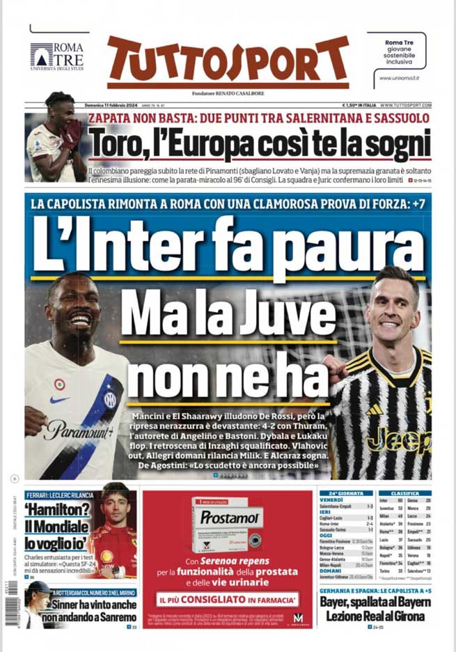 "L'Inter fa paura. Ma la Juve non ne ha", la prima pagina di Tuttosport parla della corsa scudetto con la prova di forza dell'Inter allo stadio Olimpico contro la Roma. Dall'altra parte la Juventus che proverà a diminuire il gap in classifica in casa contro l'Udinese