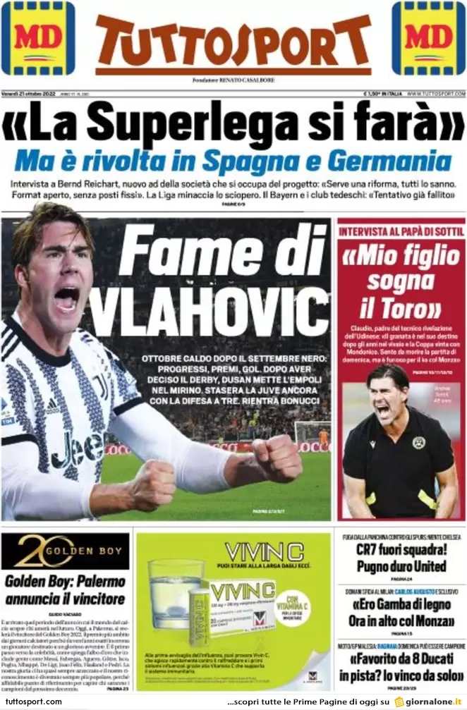 Sono tanti gli spunti che arrivano dalla prima pagina di Tuttosport. Il noto quotidiano si sofferma su alcuni degli argomenti più caldi del momento. Ecco alcuni titoli dell'ultima edizione: "La Superlega si farà. E' rivolta in Spagna e in Germania".