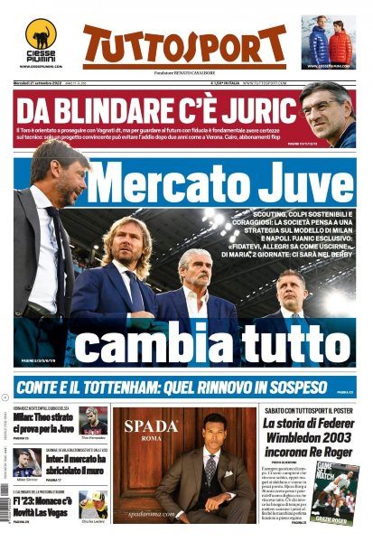La prima pagina del noto quotidiano si sofferma sui temi più caldi del momento relativi al calcio italiano e non solo.