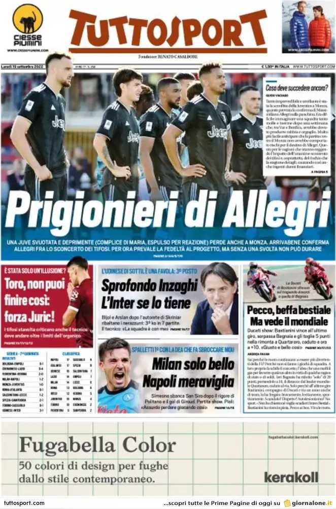 PRIMA PAGINA TUTTOSPORT - Milan solo bello, Napoli meraviglia: Simeone sbanca San Siro