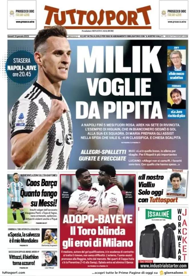 Sono tanti gli spunti che arrivano dalla prima pagina di Tuttosport. Il noto quotidiano si sofferma su alcuni degli argomenti più caldi del momento. Ecco alcuni titoli dell'ultima edizione: "Milik, voglie da Pipita. A Napoli finì 5 mesi fuori rosa: Arek ha sete di rivincita. L'esempio di Higuain, che in bianconero segnò 6 gol alla sua ex squadra". E ancora: "Allegri-Spalletti, gufate e frecciate".