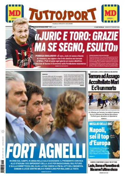 La prima pagina del noto quotidiano si sofferma sui temi più caldi del momento relativi al calcio italiano e non solo.