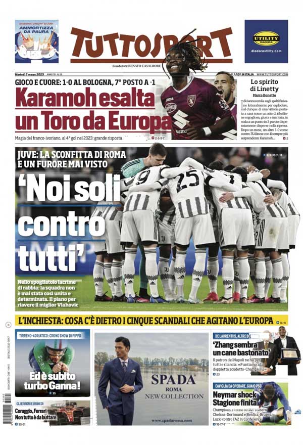 L'apertura dell'edizione odierna di Tuttosport si concentra sulla Juventus e sul momento difficile che il club bianconero sta attraversando, vista la penalizzazione di 15 punti in questo campionato, dopo la sconfitta in casa della Roma: "Noi soli contro tutti". Anche qui, ma stavolta in taglio alto, il successo del Torino contro il Bologna.