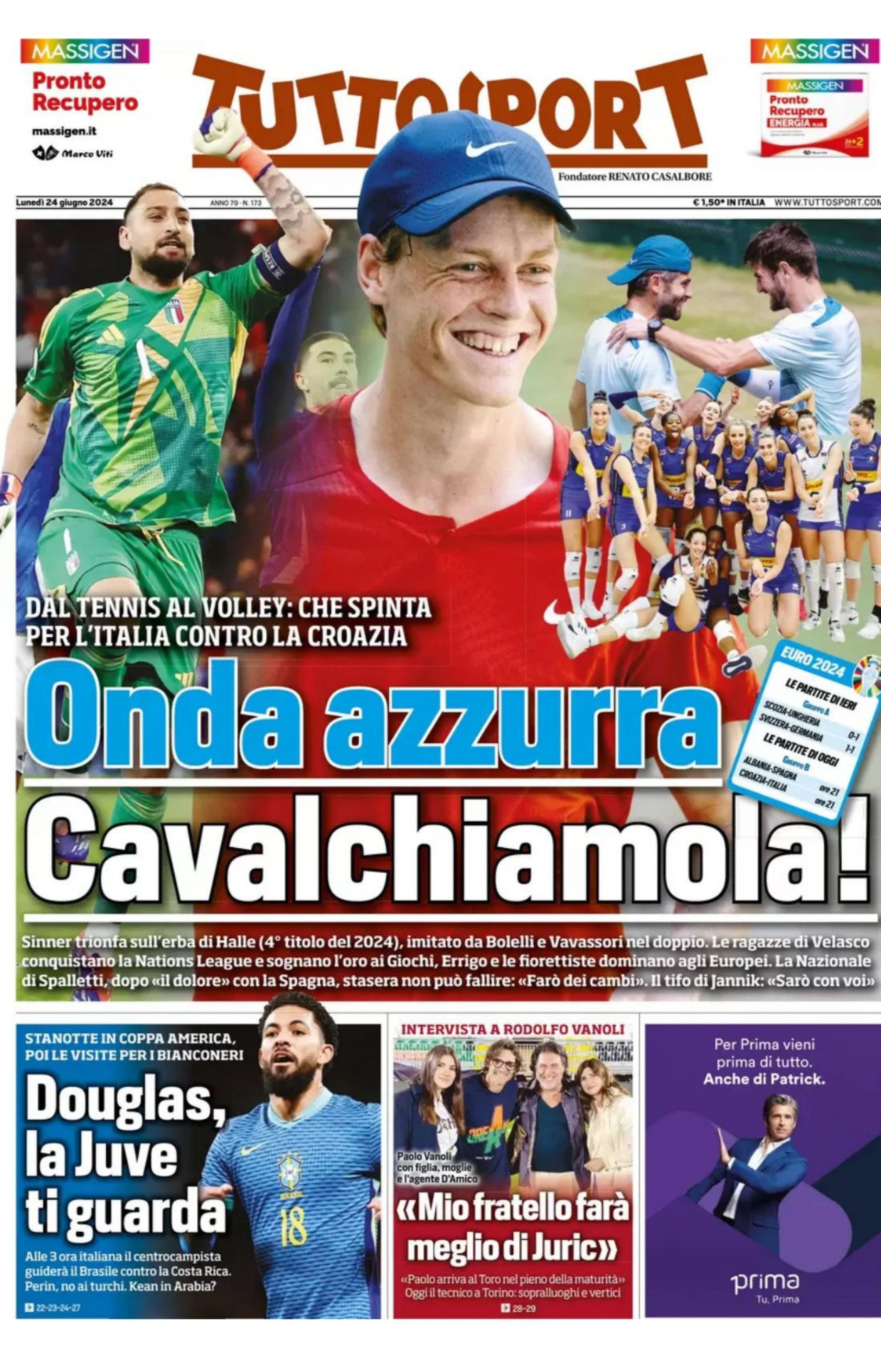 Sono tanti gli spunti che arrivano dalla prima pagina di Tuttosport. Il noto quotidiano si sofferma su alcuni degli argomenti più caldi del momento. Ecco alcuni titoli dell'ultima edizione: "Onda azzurra, cavalchiamola! Dal tennis al volley: che spinta per l'Italia contro la Croazia" si legge sul giornale.