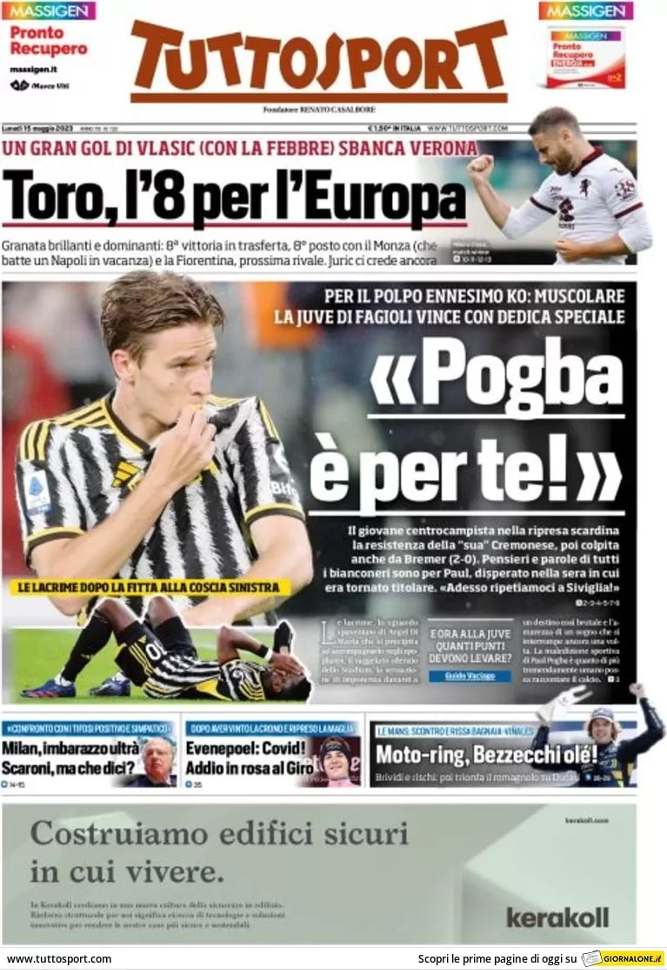 Sono tanti gli spunti che arrivano dalla prima pagina di Tuttosport. Il noto quotidiano si sofferma su alcuni degli argomenti più caldi del momento. Ecco alcuni titoli dell'ultima edizione: "Pogba, è per te! Le lacrime dopo la fitta alla coscia sinistra. La Juve di Fagioli vince con dedica speciale".