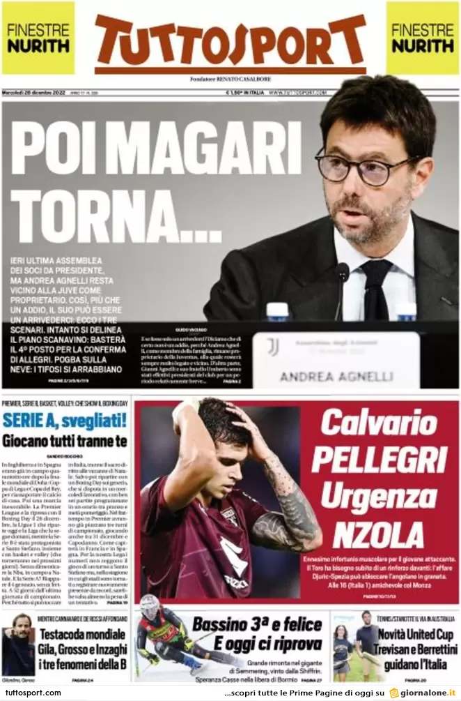 Sono tanti gli spunti che arrivano dalla prima pagina di Tuttosport. Il noto quotidiano si sofferma su alcuni degli argomenti più caldi del momento. Ecco alcuni titoli dell'ultima edizione: "Poi magari torna... Ieri ultima assemblea dei soci da presidente, ma Andrea Agnelli resta vicino alla Juve come proprietario, così, più che un addio, il suo può essere un arrivederci".