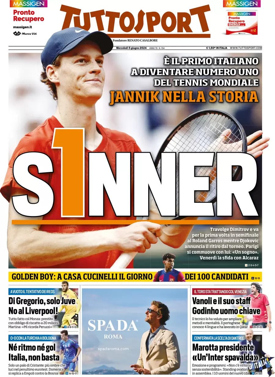 PRIMA PAGINA TUTTOSPORT - S1nner: Jannik nella storia