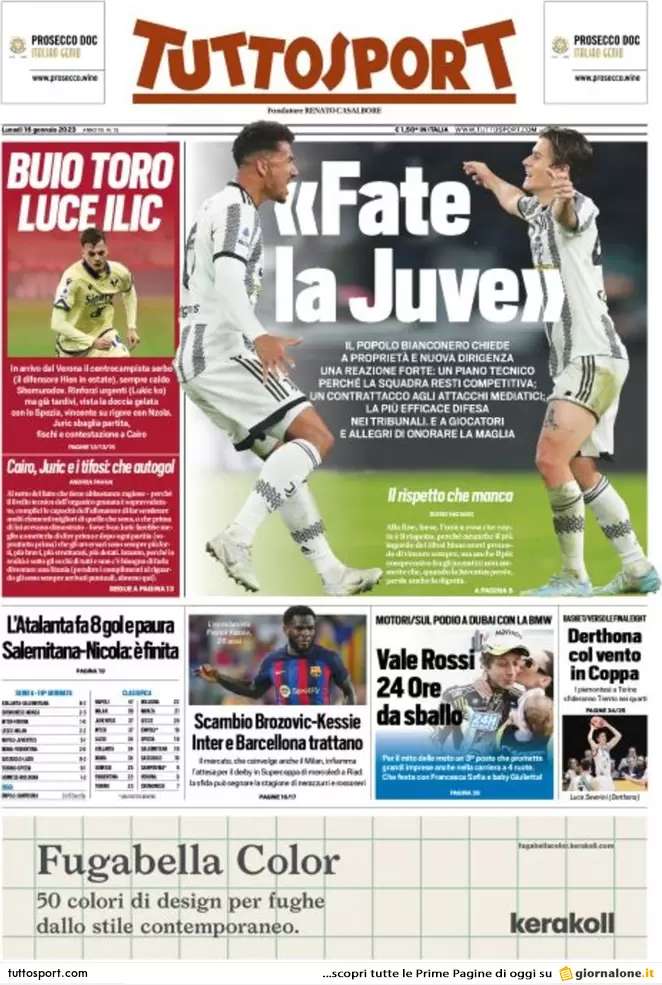 PRIMA PAGINA TUTTOSPORT - Scambio Brozovic-Kessie, Inter e Barcellona trattano